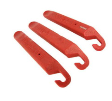 ① 타이어 레버로 타이어 일부를 벗겨내고 레버의 한쪽은 스포크에 걸어둡니다. 다른 타이어 레버로 나머지 부분을 벗겨냅니다.
