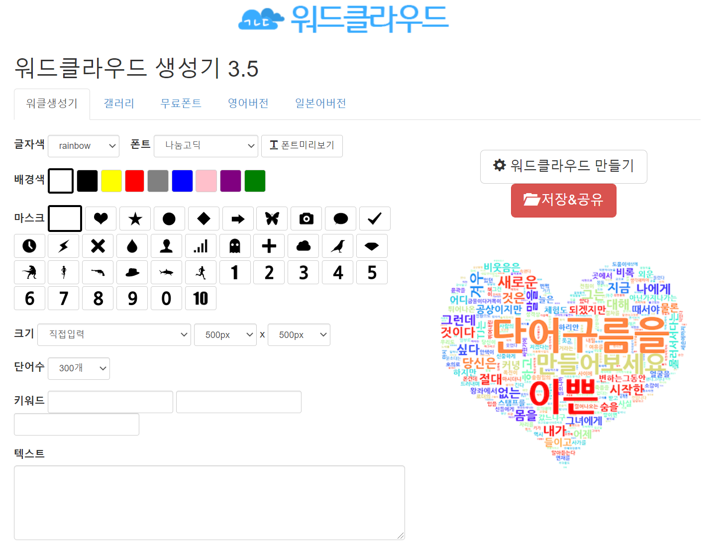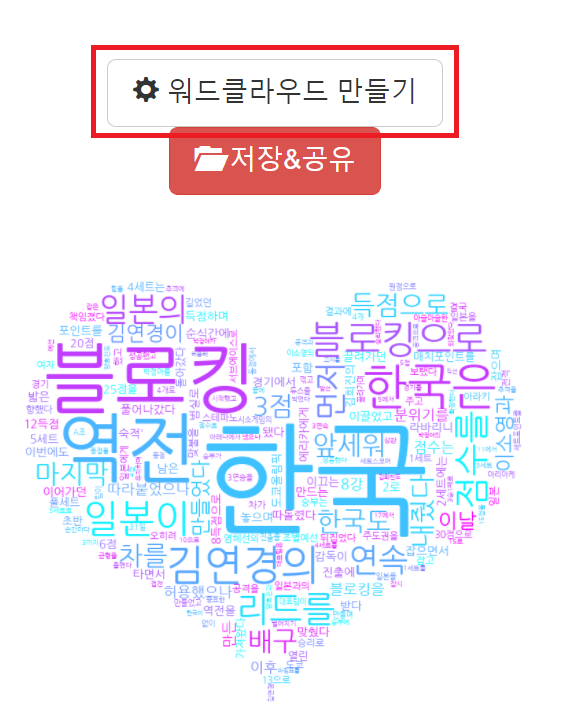 5. 워드클라우드 만들기 클릭, 수정된 클라우드 확인 후 저장&공유