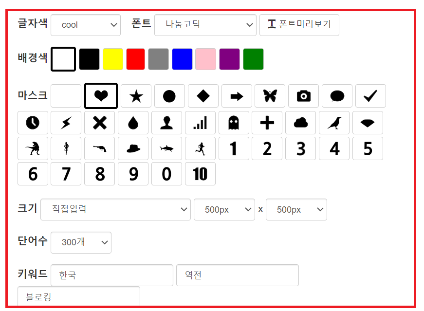 3. 글자색, 폰트, 배경색, 마스크(클라우드 모양), 크기 등을 선택