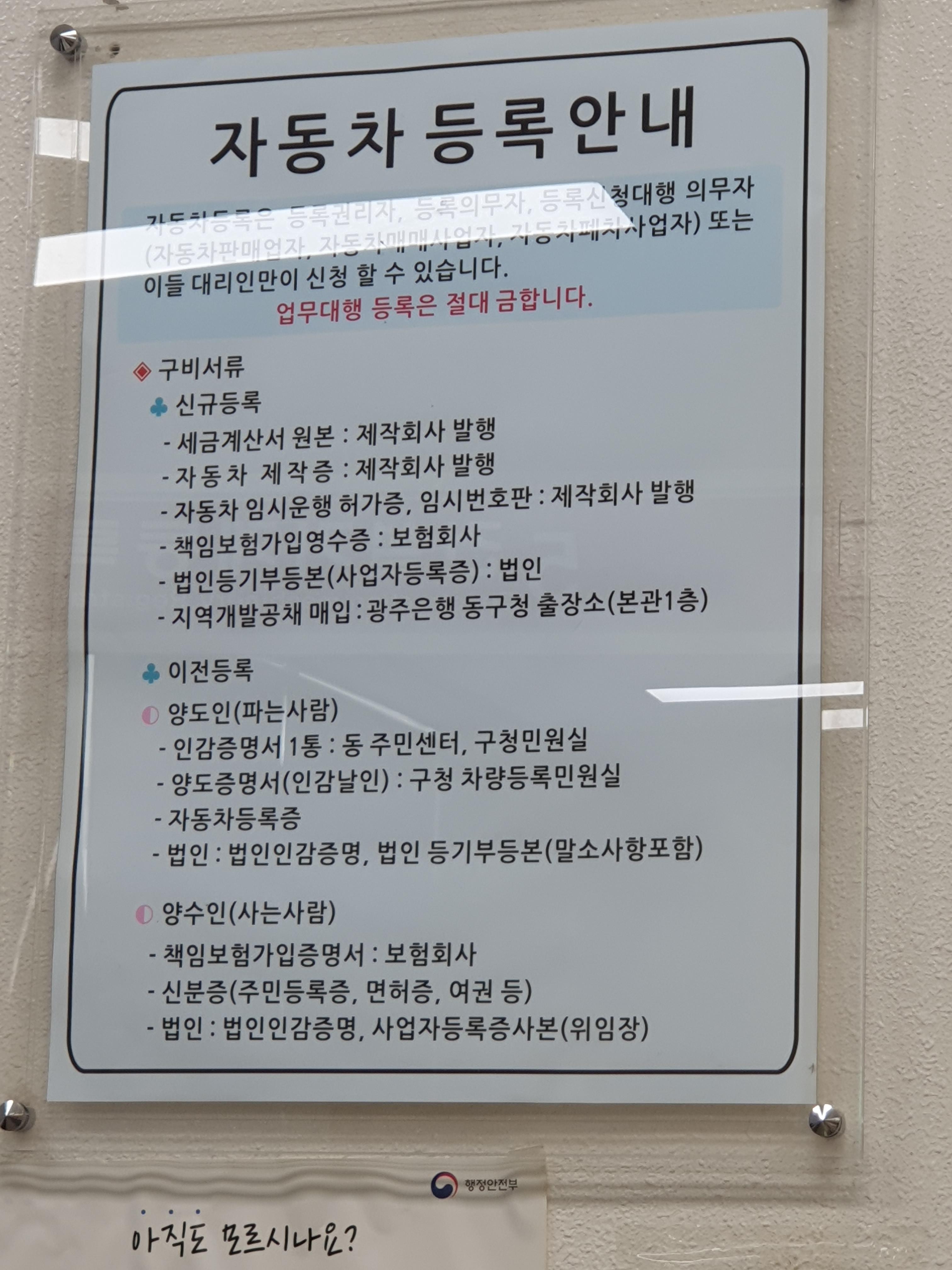 저의 주소지인 광주 동구청에 방문했습니다. 동구청에 들어가서 표지판에 따라 오른쪽으로 가니 자동차 등록 및 이전 창구가 있습니다.