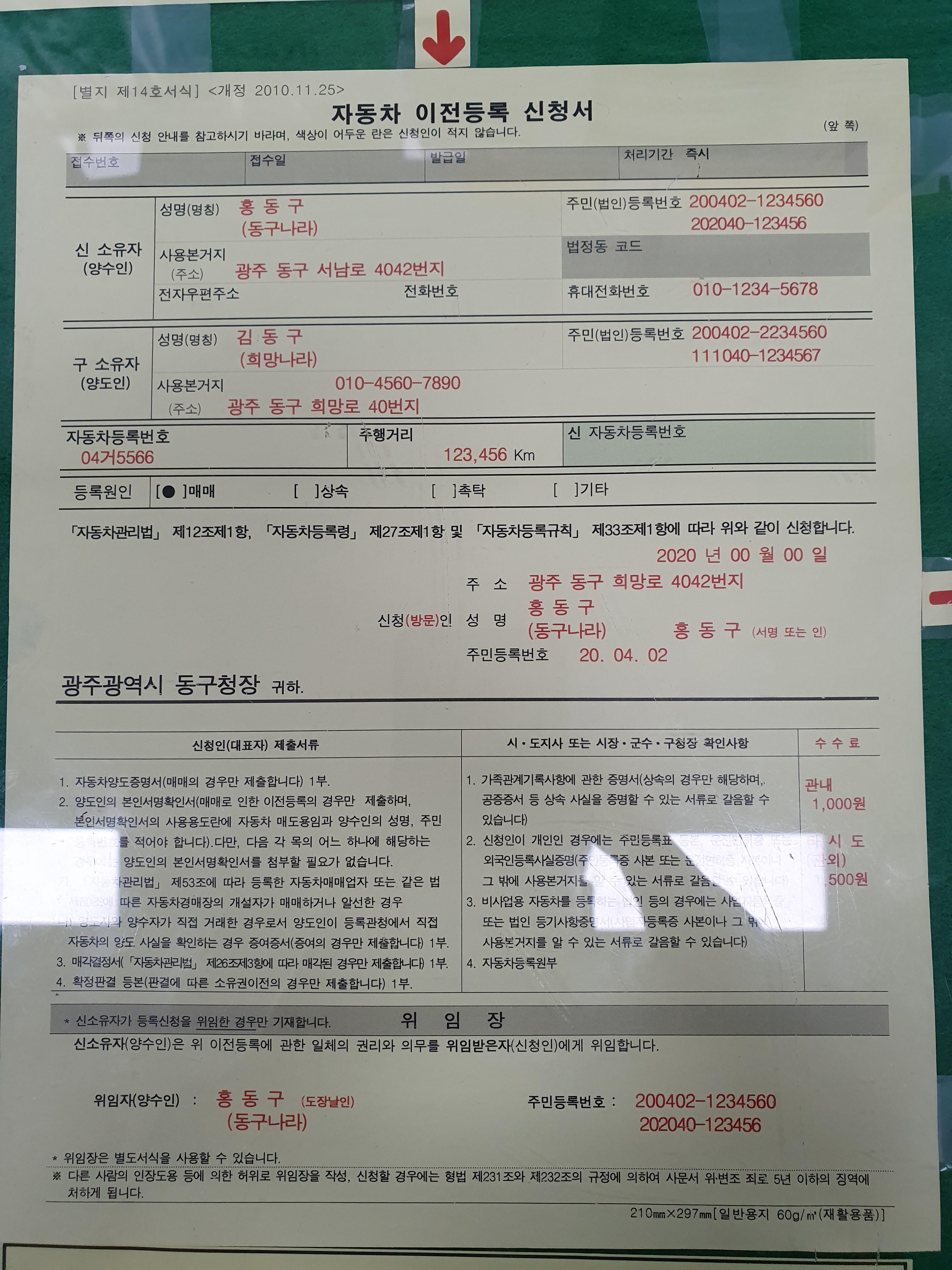 양도인, 양수인 신분증, 자동차등록증, 보험가입증서, 주행거리 사진, 수수료(현금 4000~5000원)