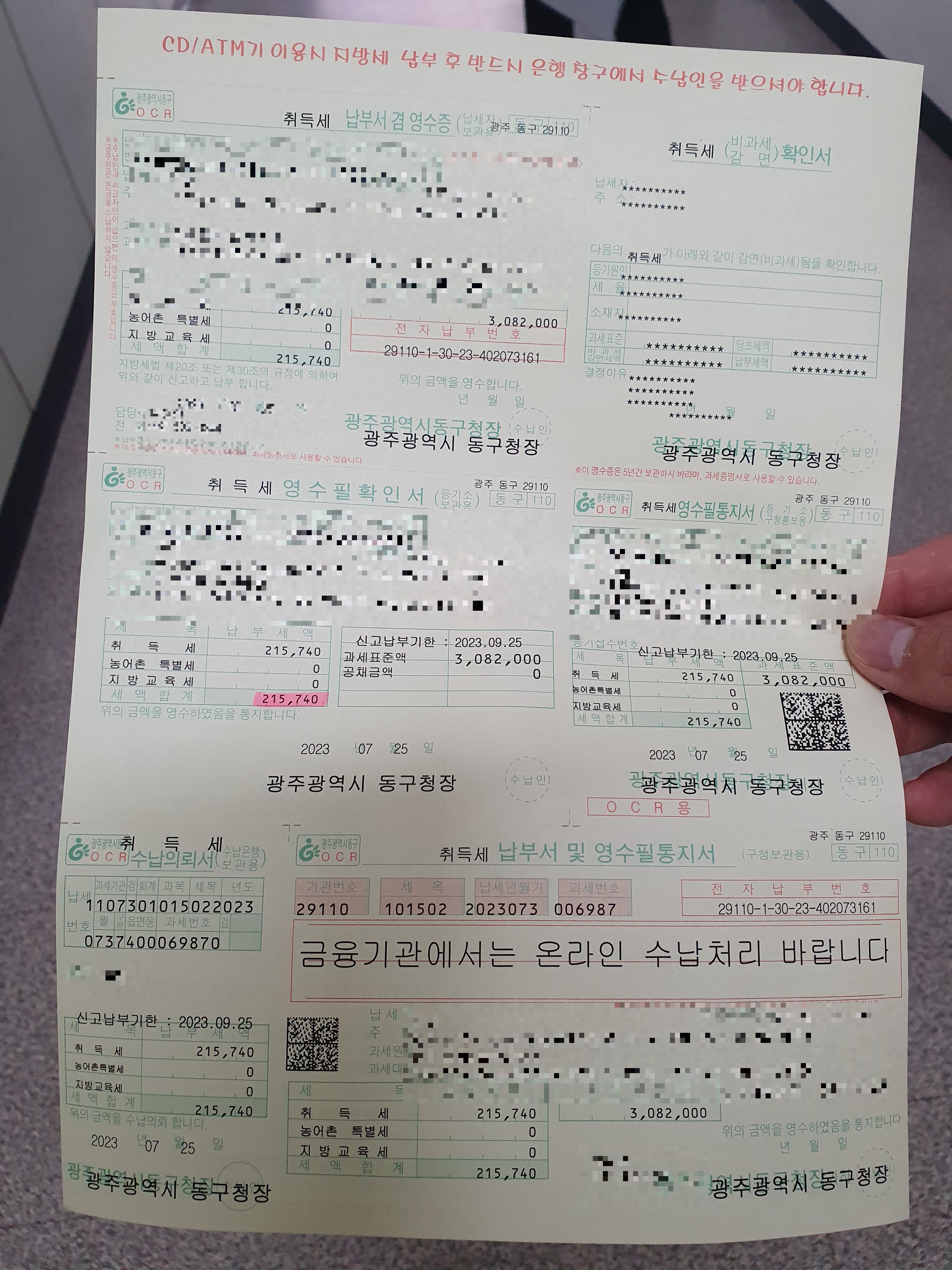 서류를 제출하면 취득세 납부서를 줍니다. 납부서를 들고 동구청 내 1층에 위치한 광주은행에 가서 취득세를 납부하면 됩니다.