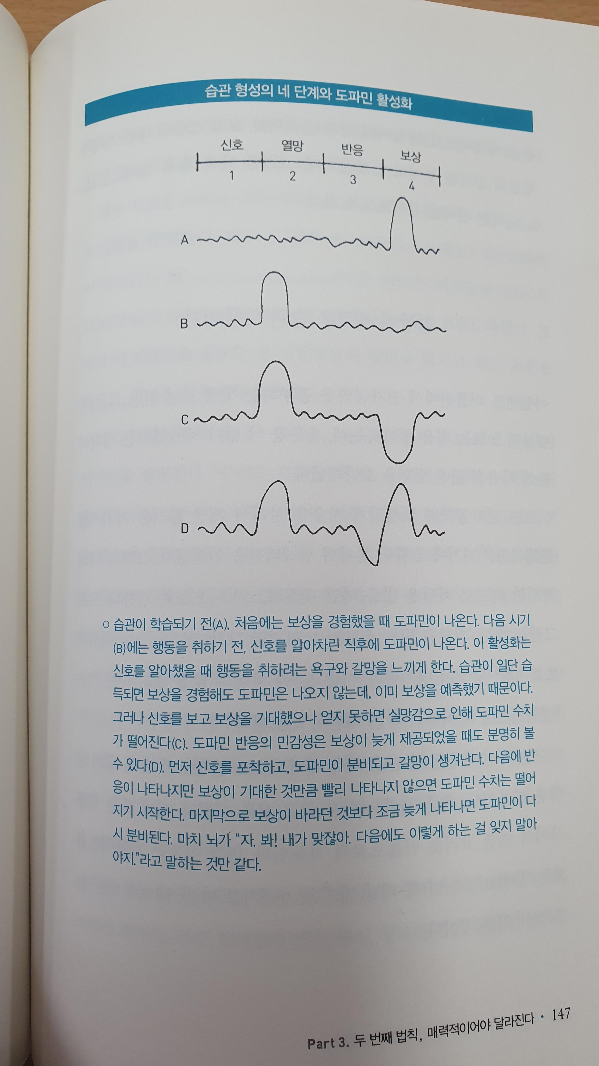 습관은 도파민이 주도하는 피드백 순환 작용이다. 도파민은 즐거운 경험을 할 때뿐만 아니라 즐거운 경험이 예상될 때도 분비된다. 보상이 예상될 때 그 기대감으로 도파민 수치가 올라가는 것이다.