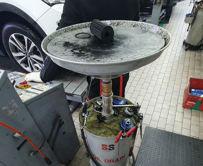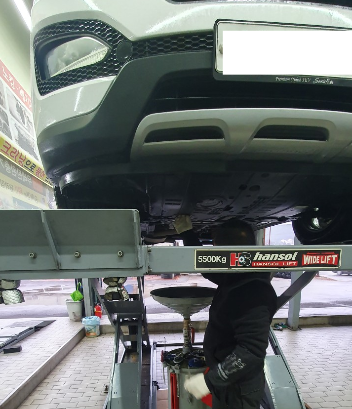 ② 차를 들어올리고 기존 엔진오일 제거(차를 약간 기울게 해서 잔유까지 제거)