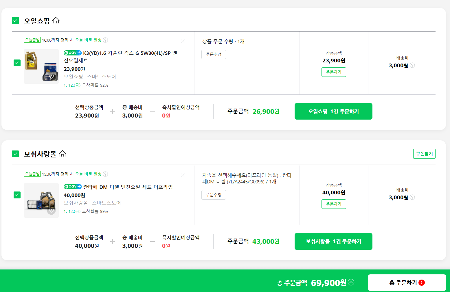 ② 오일쇼핑 K3 엔진오일 세트 26,900원(배송비 포함)