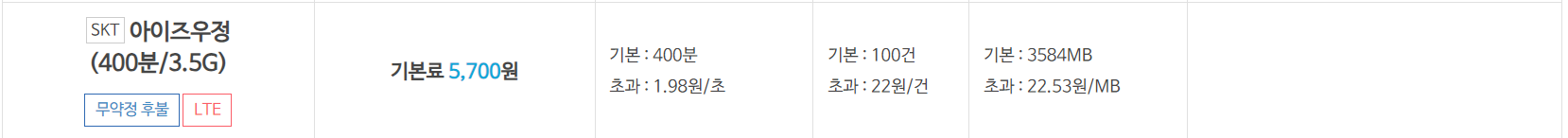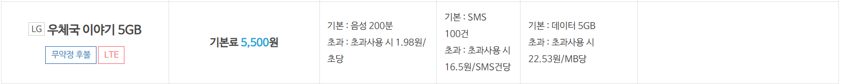 ② 우체국500분5G : 5G / 500분 / 100건 / 7,700원③ 아이즈우정 : 3.5G / 400분 / 100건 / 5,700원