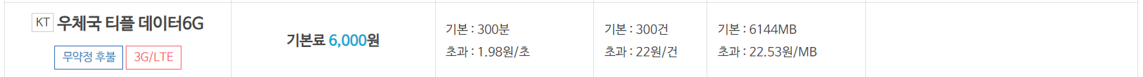 ⑧ 우체국티플 : 6G / 300분 / 300건 / 6,000원