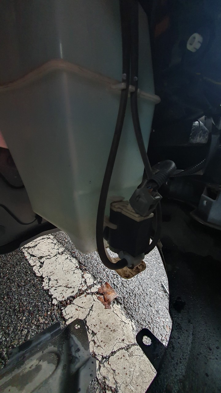 나사를 풀고 빗물받이를 살짝 걷어내자 워셔액통과 오토펌프의 모습이 드러납니다. 위쪽의 연결잭을 버튼을 누르고 잡아당겨서 제거하고, 아래쪽에 호스를 모두 빼줍니다. 그리고 오토펌프를 잡아당기면 워셔액 통과 분리됩니다.