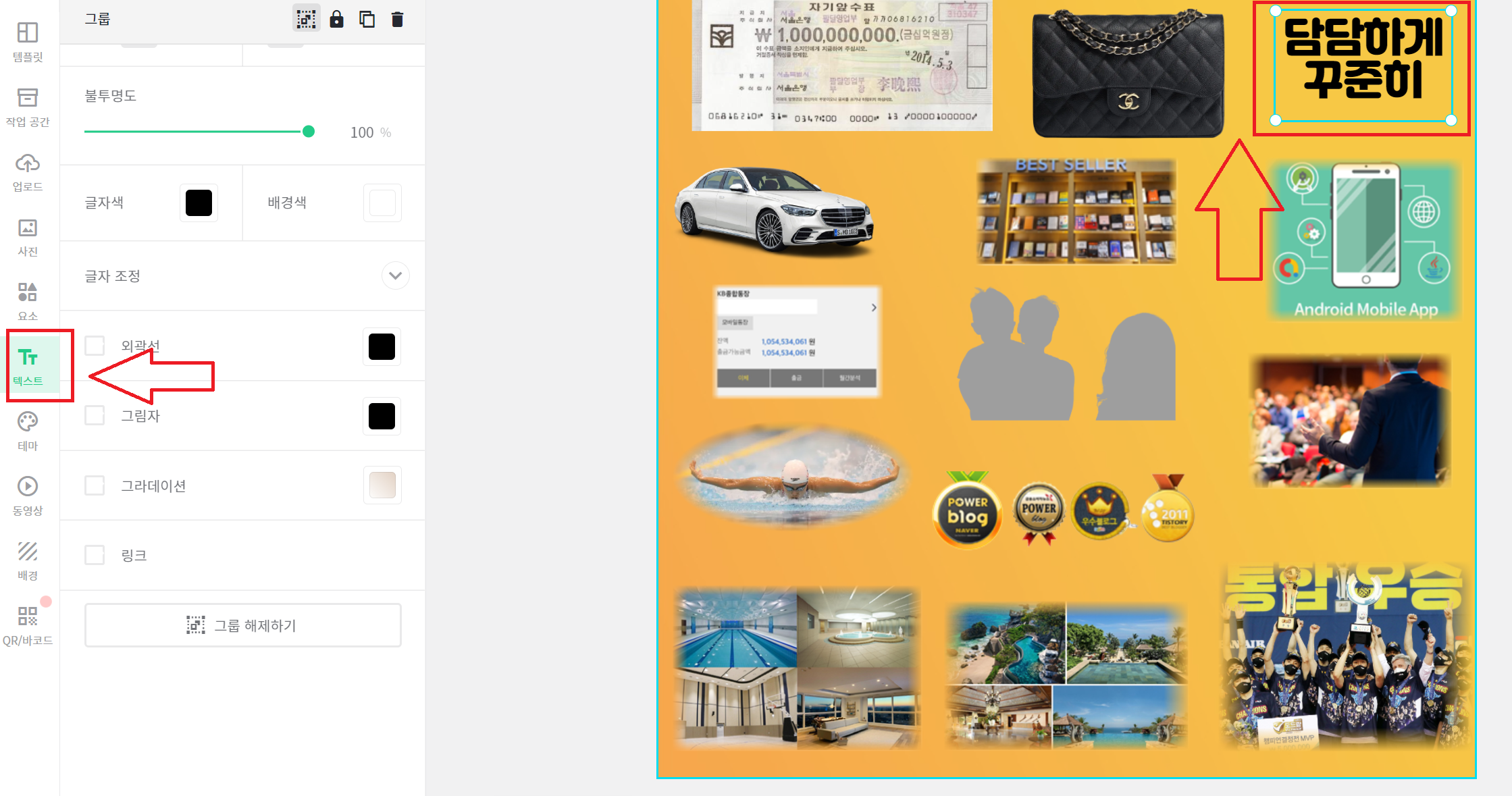 이미지와 문구를 수집하였다면, 이제 자료들을 잘 배열해보자. 한글파일이나 그림판 등 전자문서를 활용해도 좋고, 스케치북이나 색지에 해도 좋다. 나는 미리캠버스로 비전보드를 만들어보았다. 미리캠버스는 사진을 첨부하고 수정하기 용이하고, 문구도 쉽게 넣을 수 있다. 비전보드의 바탕색으로 시각적인 집중도를 높여줄 수도 있다. 다이어트, 근육질 몸매만들기 등 에너지가 넘치게 표현하고 싶다면 빨간색 배경, 삶의 평화와 안정을 얻는 것이 목표라면 하늘색이 어울릴 수 있다. 가운데에 나 자신의 사진이나 가족의 사진을 두고 주변을 이미지와 문구로 표현해보자.