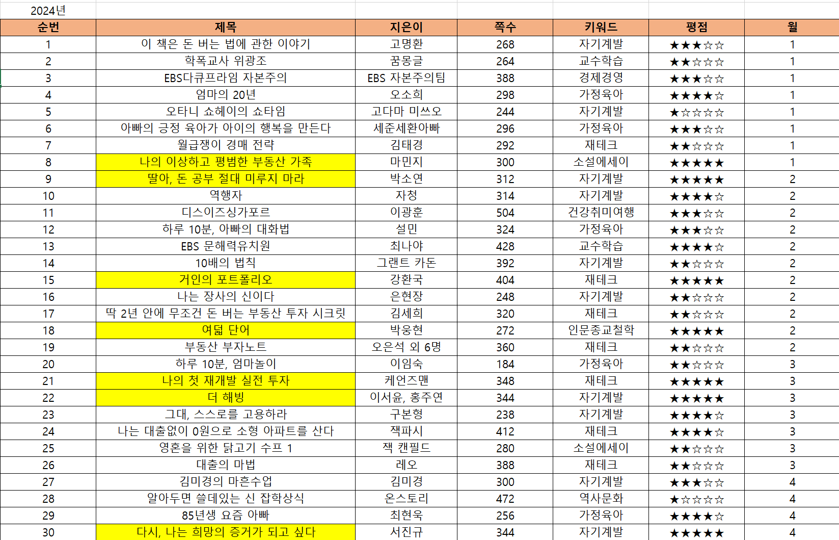 제목 - 지은이 - 쪽수 - 키워드분류 - 개인적인평점 - 책읽은달