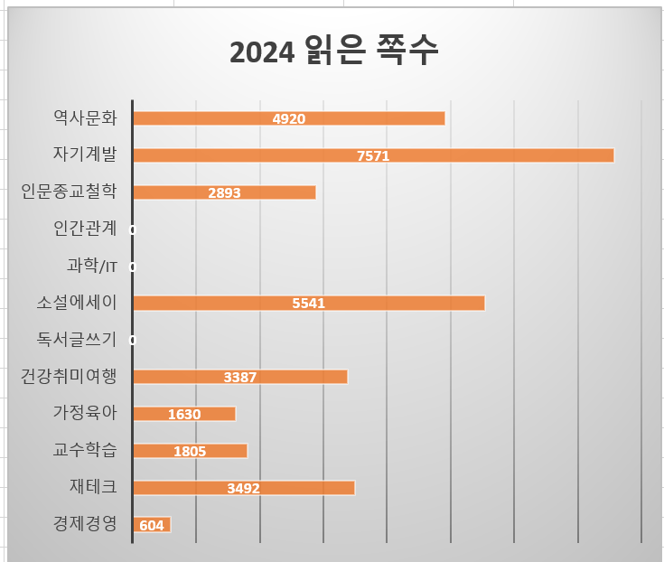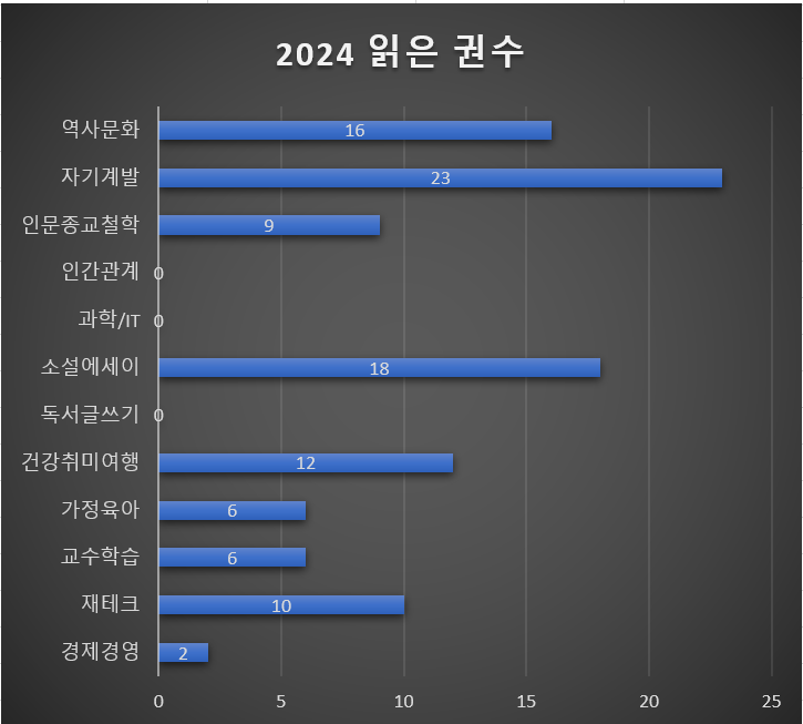 2024년에는 여전히 자기계발 분야 책이 많은 가운데, 소설에세이와 역사책을 많이 읽었습니다. 2023년가지는 소설에세이, 역사책을 거의 읽지 않은 점과 대조적이네요.