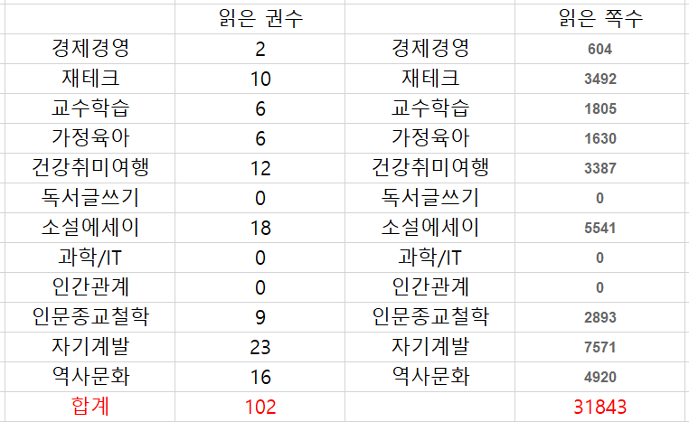 12가지 분야별로 주로 어떤 책을 어느 정도 읽었는지 파악했고, 이를 통해 나의 책 습관을 돌아보기도 하고 선택과 집중의 자료로 활용하기로 했습니다.