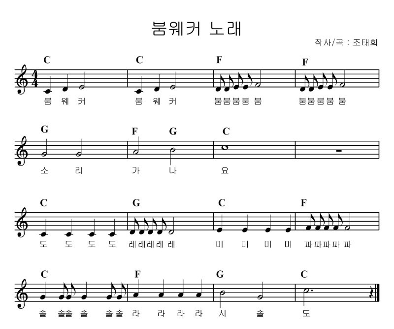 첫 시간에는 붐웨커 노래를 배워보았다. 초등교사 조태희 선생님이 직접 작곡한 노래이다. 노래가 매우 쉽기 때문에 반주에 맞춰 가사를 읽어보고 노래를 배우고, 계이름을 불러보는 시간을 가진다. 각자 1개(붐웨커의 개수가 넉넉하다면 2개씩 들어도 된다)씩 붐웨커를 들고 연주를 해본다. 음계에 순서에 따라 도레미파솔라시도로 곡선으로 둘러앉으면 서로 순서가 눈에 보여 실수를 줄일 수 있다.