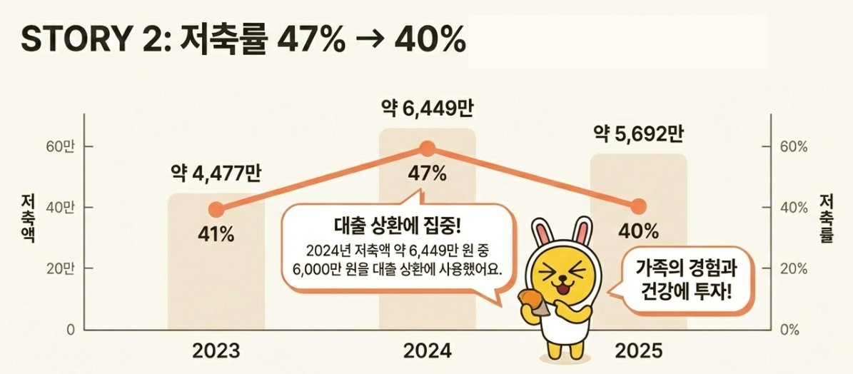 2024년에는 대출 상환에 집중하며 저축률을 47%까지 끌어올렸으나, 2025년에는 저축보다는 '가족의 경험과 건강'에 더 많은 가치를 두기로 결정(?)하면서 저축액이 전년 대비 약 757만 원 정도 감소했습니다.