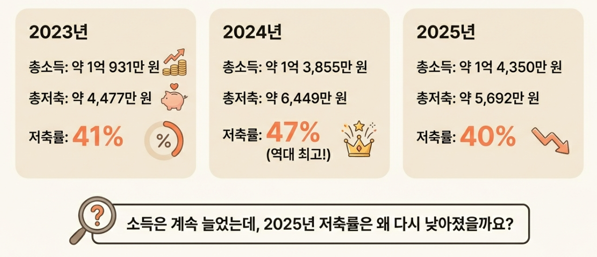 • 2025년: 저축액 약 5,692만 원 (저축률 40%)