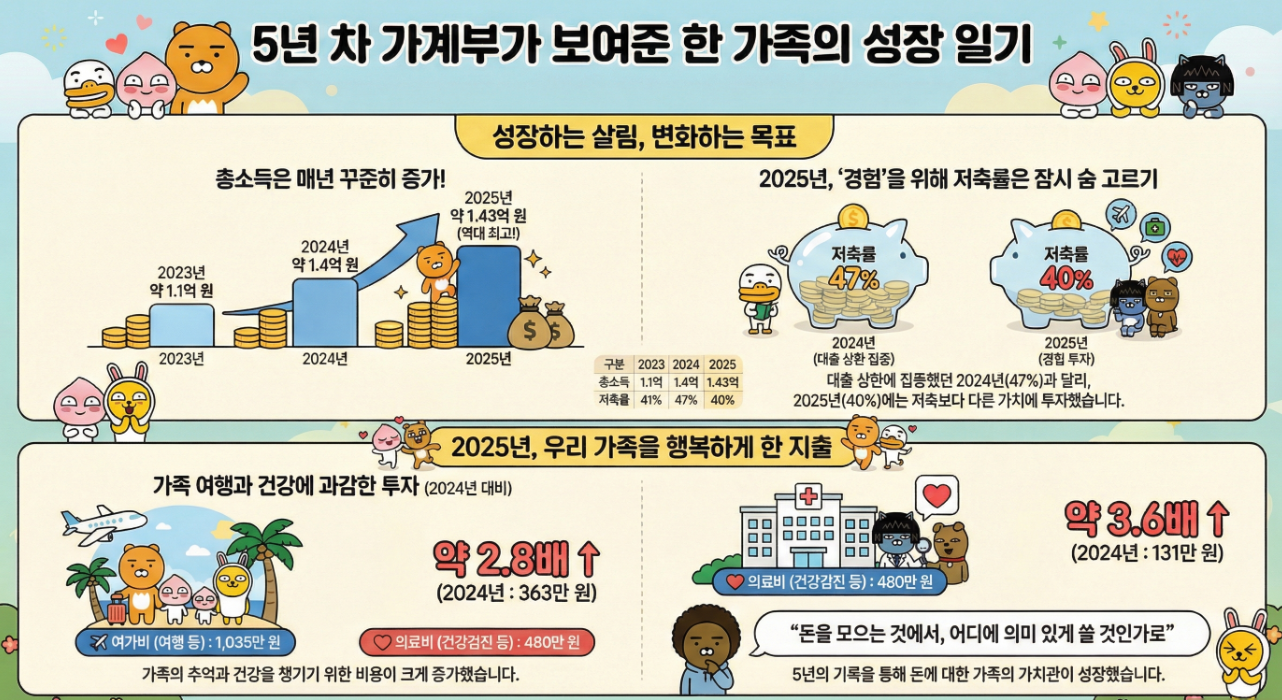 가계부를 처음 쓰기 시작했을 때는 단순히 '돈을 모으는 것'이 목표였지만, 5년이 지난 지금은 '돈을 어디에 의미 있게 쓸 것인가'도 늘 고민하게 됩니다. 2025년은 저축률 50%라는 목표를 달성하지는 못했지만, 가족이 함께 웃으며 여행하고 건강을 돌본 덕분에 그 어느 해보다 의미있는 한 해였습니다.