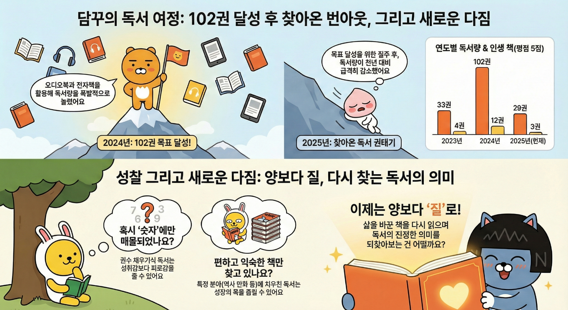 독서량이 줄었다고 해서 2025년에 제 성장이 머물러 있었다고는 여기지 않습니다. 독서 말고 업무적으로 개인적인 성과를 낸 부분도 분명 있기 때문입니다. 2023년에도 독서량이 줄었을 때 '게을러진 면이 있다'고 자책했지만, 결국 2024년에 100권 독서를 통해 다시 일어섰던 경험이 있습니다.