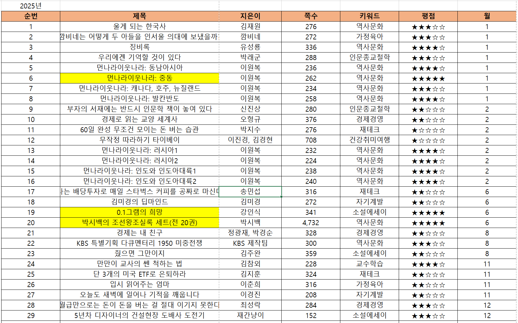 • 지나친 특정 분야 쏠림: 2025년 기록을 보면 역사·문화 분야가 12권(7,568쪽)으로 전체 분량의 절반 이상을 차지합니다. 특히 '박시백의 조선왕조실록' 20권 세트와 '먼나라 이웃나라' 시리즈 등 만화 형식이 포함된 역사서 위주로 편중되어 있는데, 이는 지적 즐거움을 주지만 한편으론 읽기 편한 책 위주로 고른 것 같습니다. 사실 책 읽기가 잘 되지 않아 그나마 관심이 가는 역사 만화를 보게 된 것 같습니다.