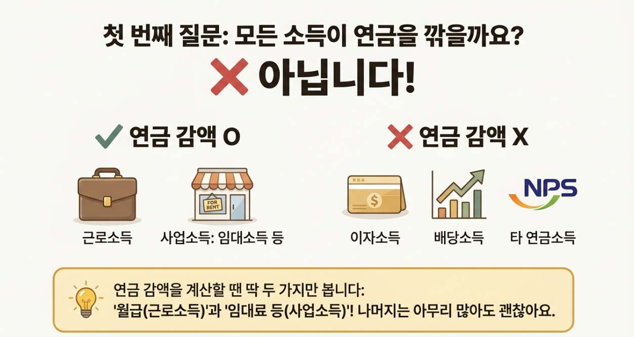아닙니다! 연금을 깎을지 말지 결정할 때 포함되는 소득은 딱 두 가지입니다.