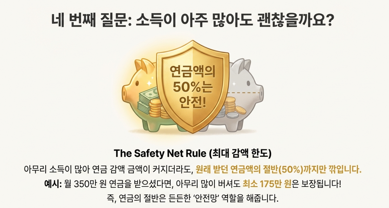 • 최대 절반까지만: 소득이 아주 많아도 보통은 원래 받던 연금액의 50%까지만 깎입니다. 즉, 아무리 돈을 많이 벌어도 연금의 절반은 받을 수 있다는 뜻이죠.