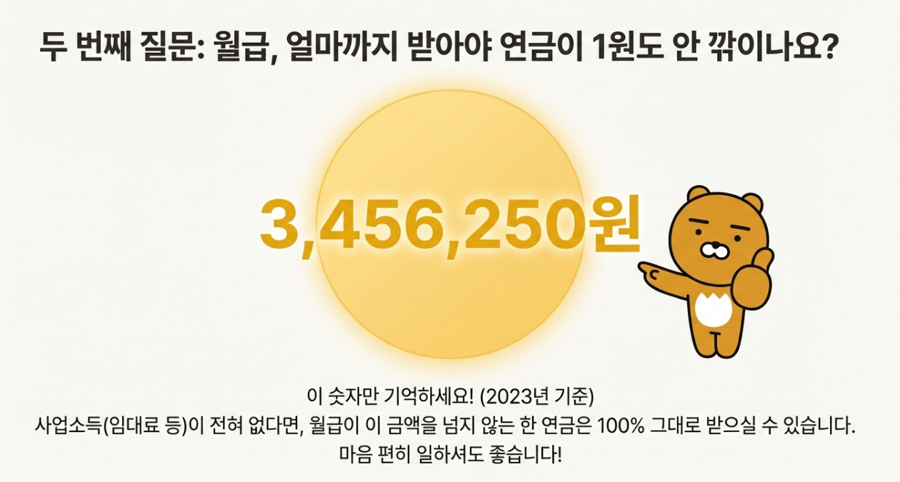 2023년 기준으로, 월급이 3,456,250원 이하라면 연금이 단 1원도 깎이지 않습니다.