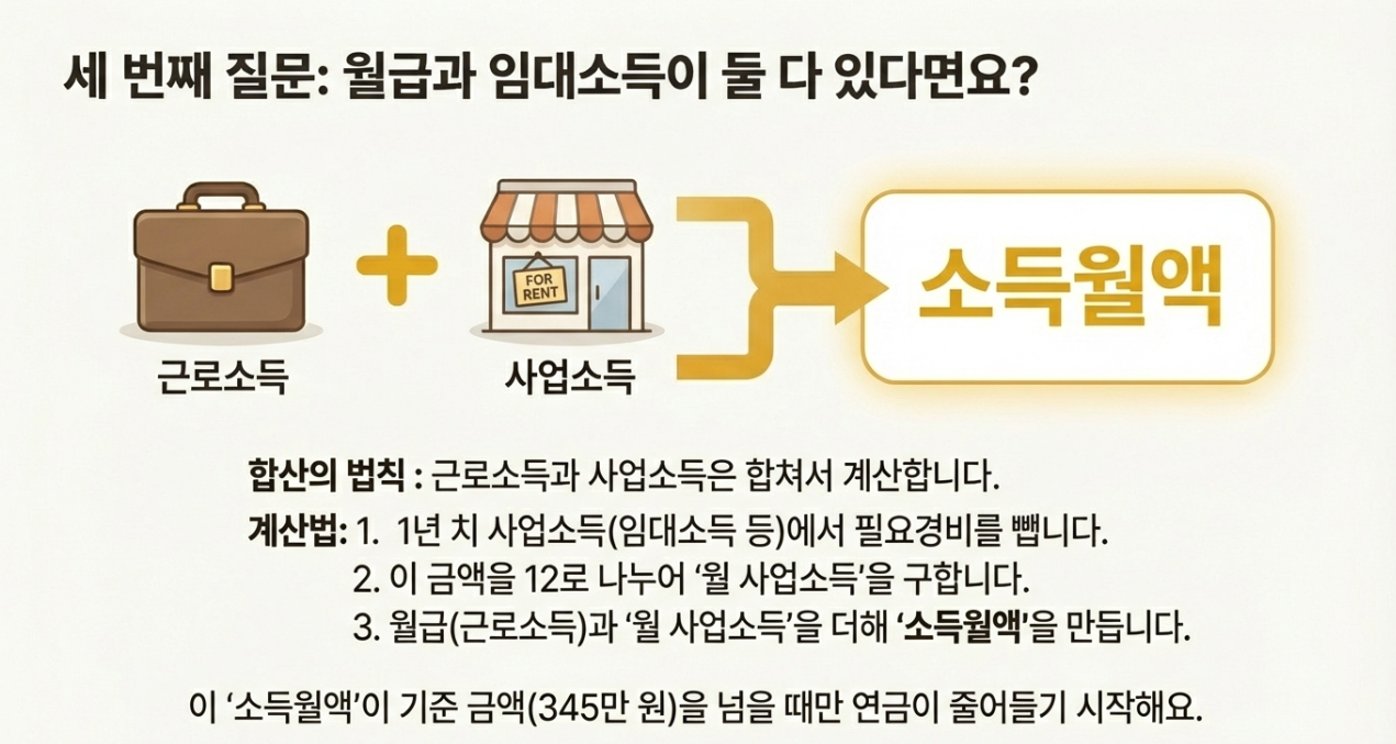 임대소득은 '사업소득'에 해당하여 연금 감액 계산에 포함되긴 합니다. 하지만 연금이 깎일 가능성은 매우 낮습니다.