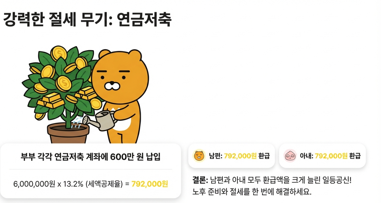 작년에 이에 절세 방안으로 아내와 제 명의의 연금 저축에 각 600만 원씩을 입급했습니다. 13.2%인 792,000원을 돌려받게 되었습니다.