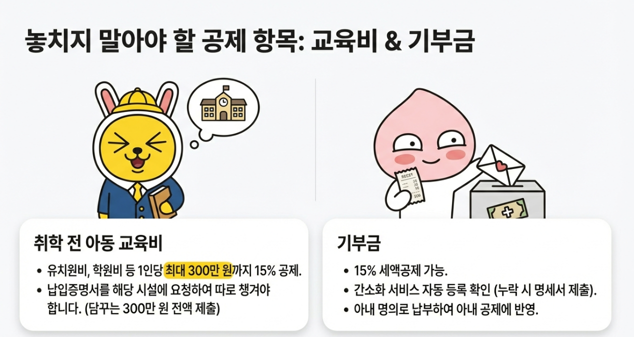 자녀 세액공제를 남편이 기본공제 대상자로 신고했다면, 아내는 자녀들에 대한 의료비, 교육비 등 기타 항목에 대한 공제를 받지 못합니다.
