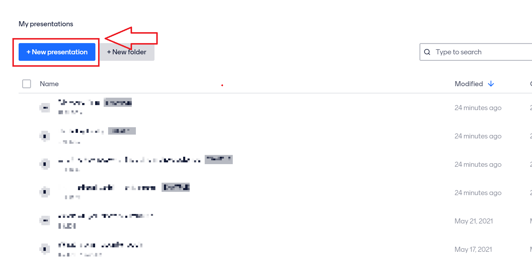 화면 좌측의 'New presentation' 을 클릭하여 새로운 프리젠테이션을 만든다.