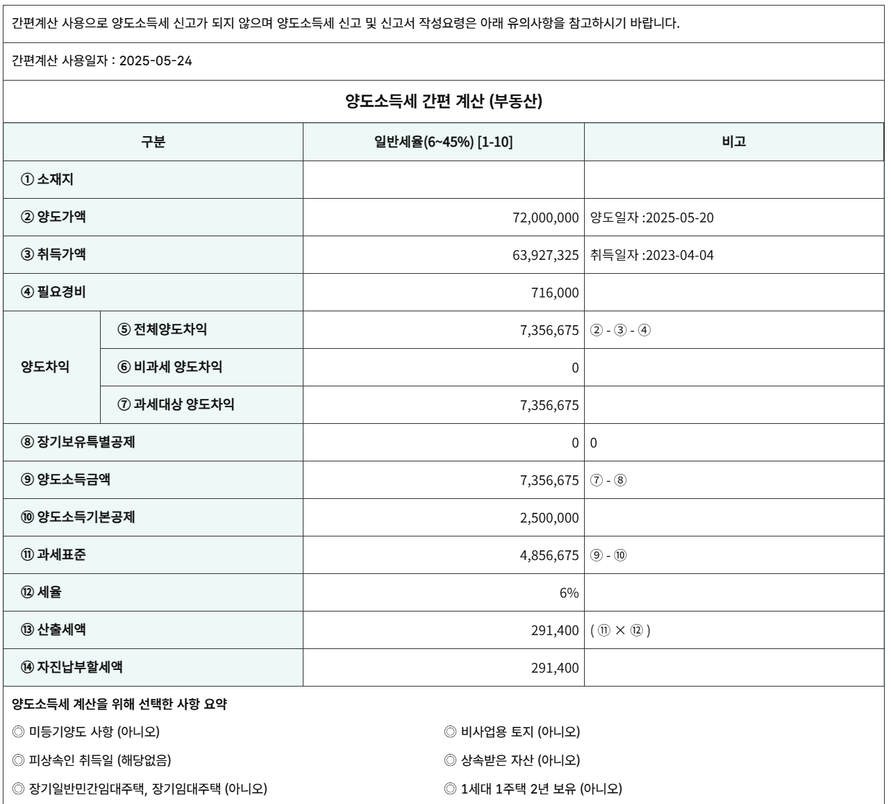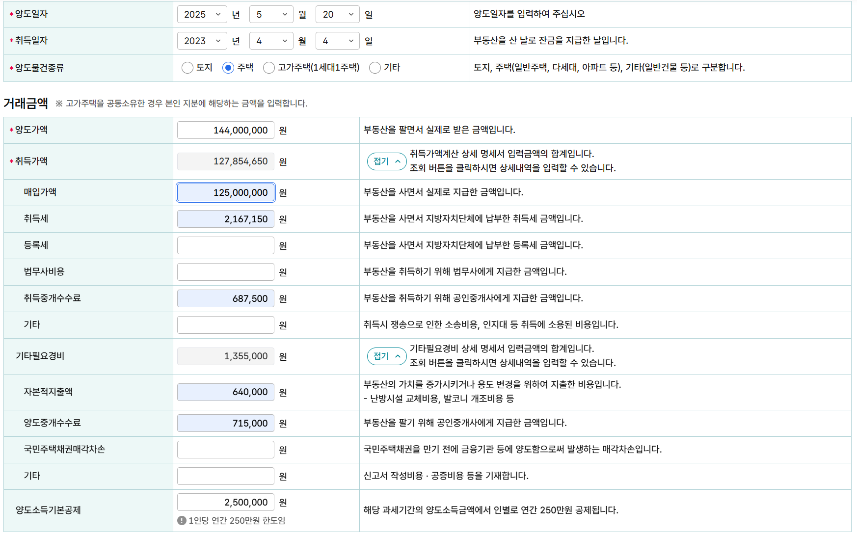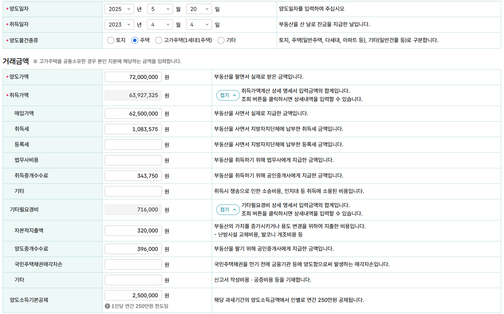세금 계산은 국세청 홈택스를 이용하였습니다. 양도일자와 취득일자는 2년이 지나도록 임의로 지정해주고 금액을 입력합니다.